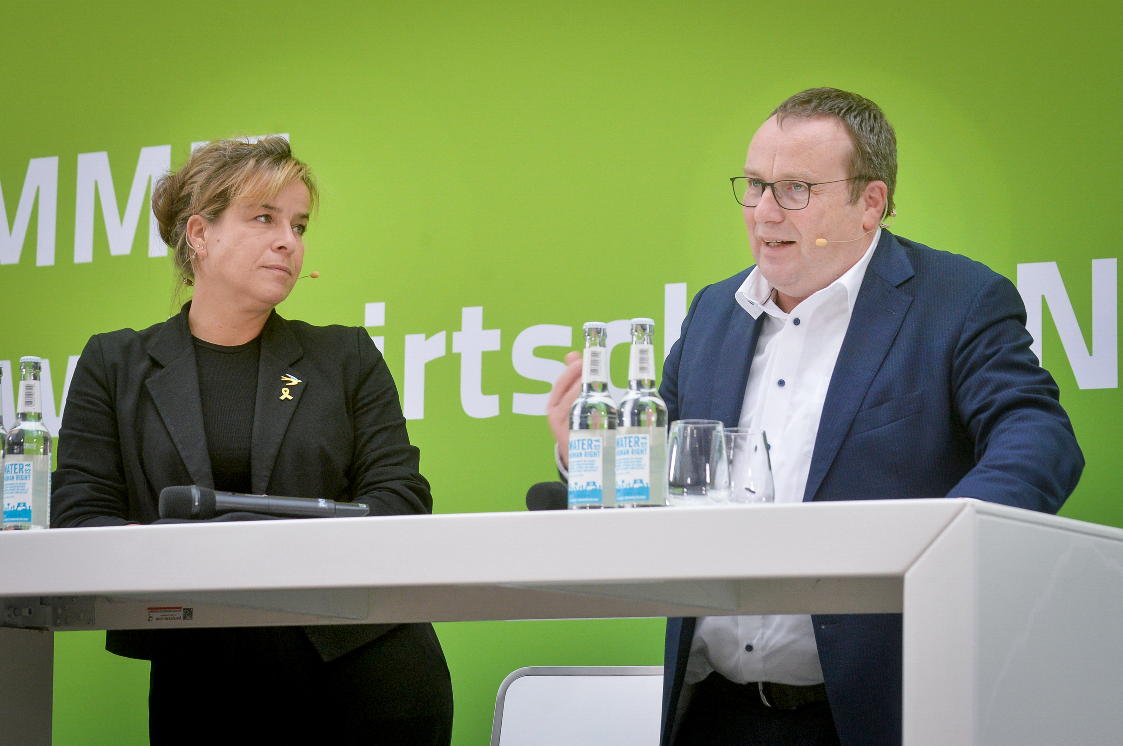 Im anschließenden Talk sprachen Umweltminister Oliver Krischer und Wirtschaftsministerin Mona Neubaur über die Rolle der Umweltwirtschaft für den Wirtschaftsstandort Nordrhein-Westfalen.